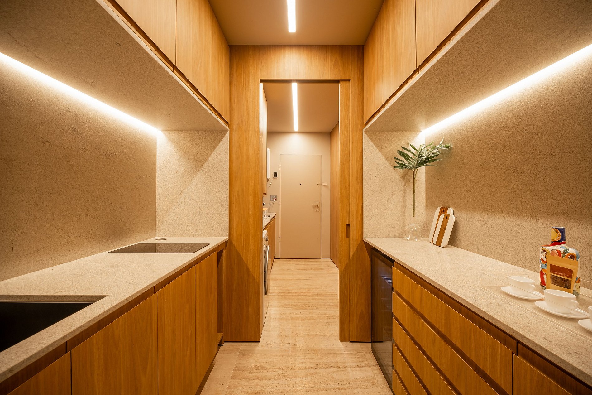 Spanning 200m² of travertine marble across two floors that balance privacy and togetherness: the first features a spacious king suite, an additional queen bedroom, a full bathroom, a complete kitchen, and generous living and dining areas. The second offers a fully integrated space with a 75" TV lounge, a gourmet kitchen with cooktop, a powder room, and a private travertine-lined pool — the perfect setting to unwind at the end of the day.