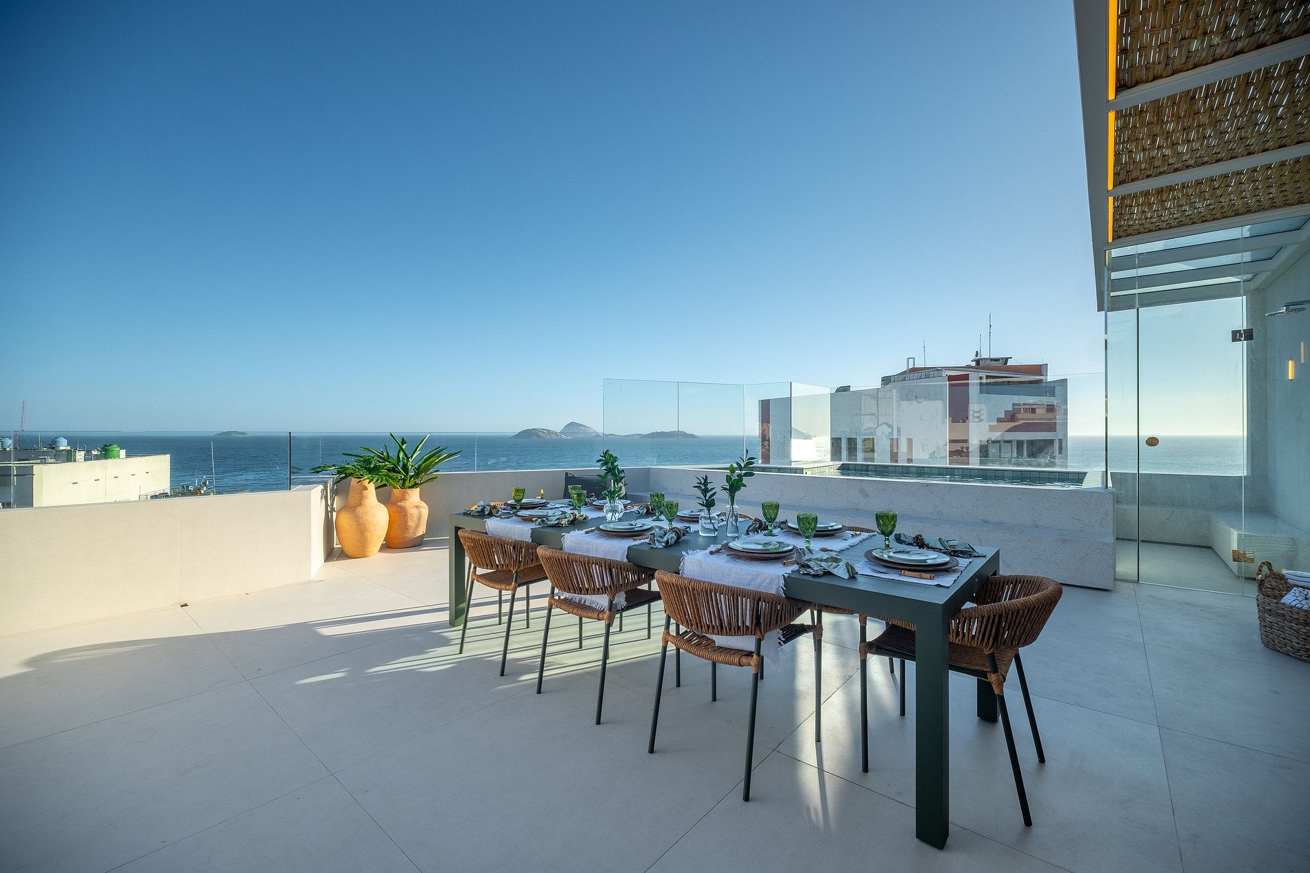 • 340 m² penthouse with 4 bedrooms, including 3 en-suite, featuring a private terrace with pool, sauna and barbecue, with ocean views of Ipanema and Leblon.