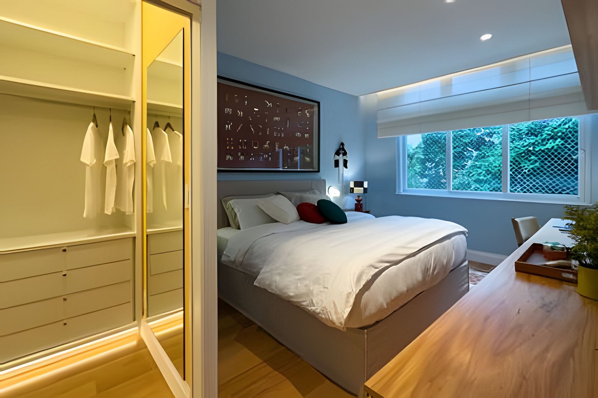 The property features 3 spacious suites — including options with king, queen, and double beds — plus an additional bedroom and a full guest bathroom. It comfortably accommodates up to 8 guests. The social area integrates living and dining rooms, offering bright, airy, and functional spaces. The kitchen is equipped with modern appliances and high-quality utensils, as well as a countertop for quick meals. The apartment also includes a service area with a washer-dryer, a service room with bathroom, a guest restroom, and even a dedicated workout space.