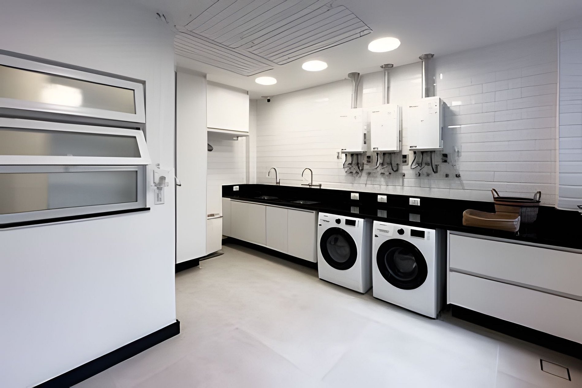 Área de servicio funcional con lavadora-secadora, tendedero y espacio fitness