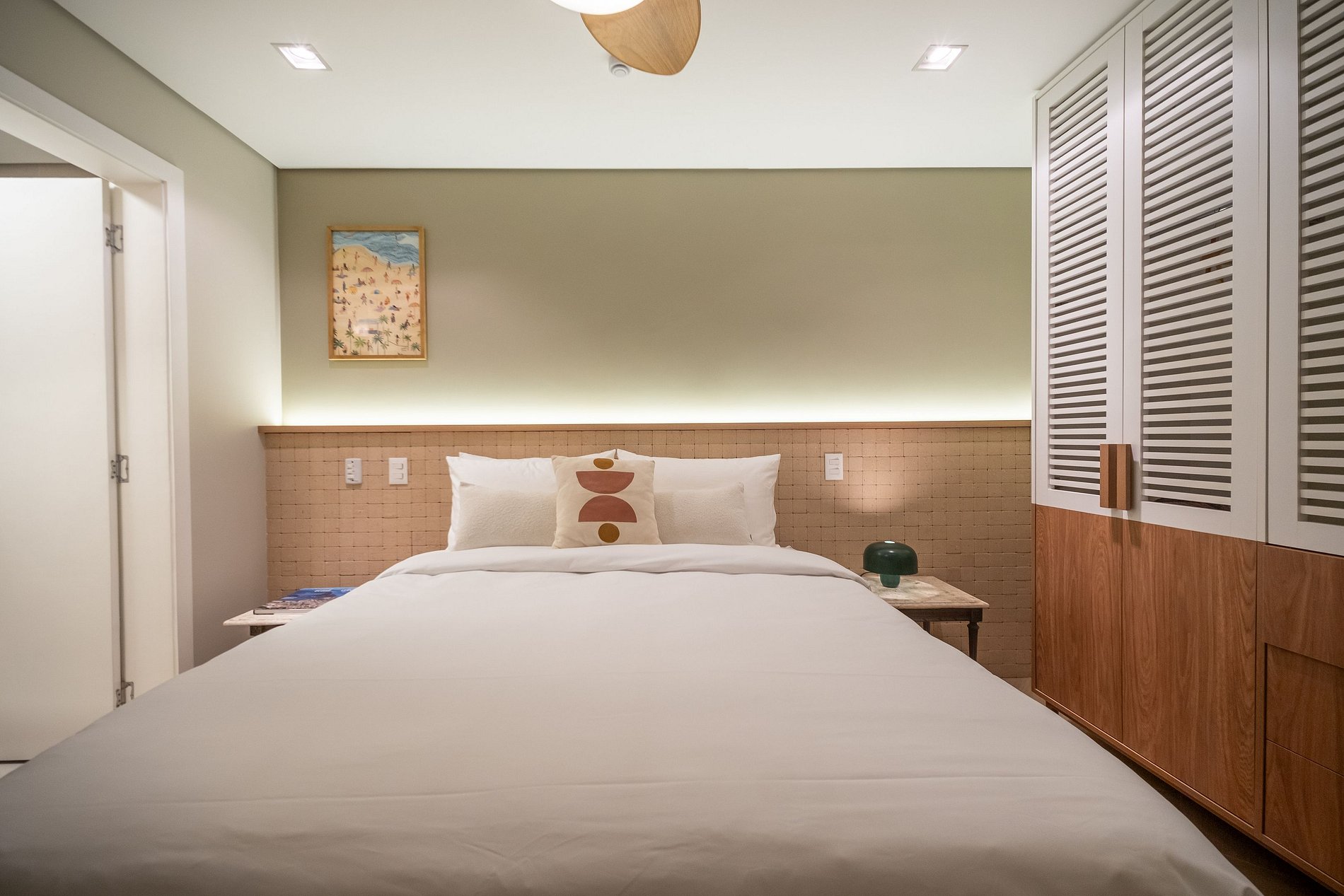 • Suíte Master: cama queen (1,58 x 1,98) com enxoval padrão 5 estrelas, garantindo conforto e noites de descanso impecáveis.