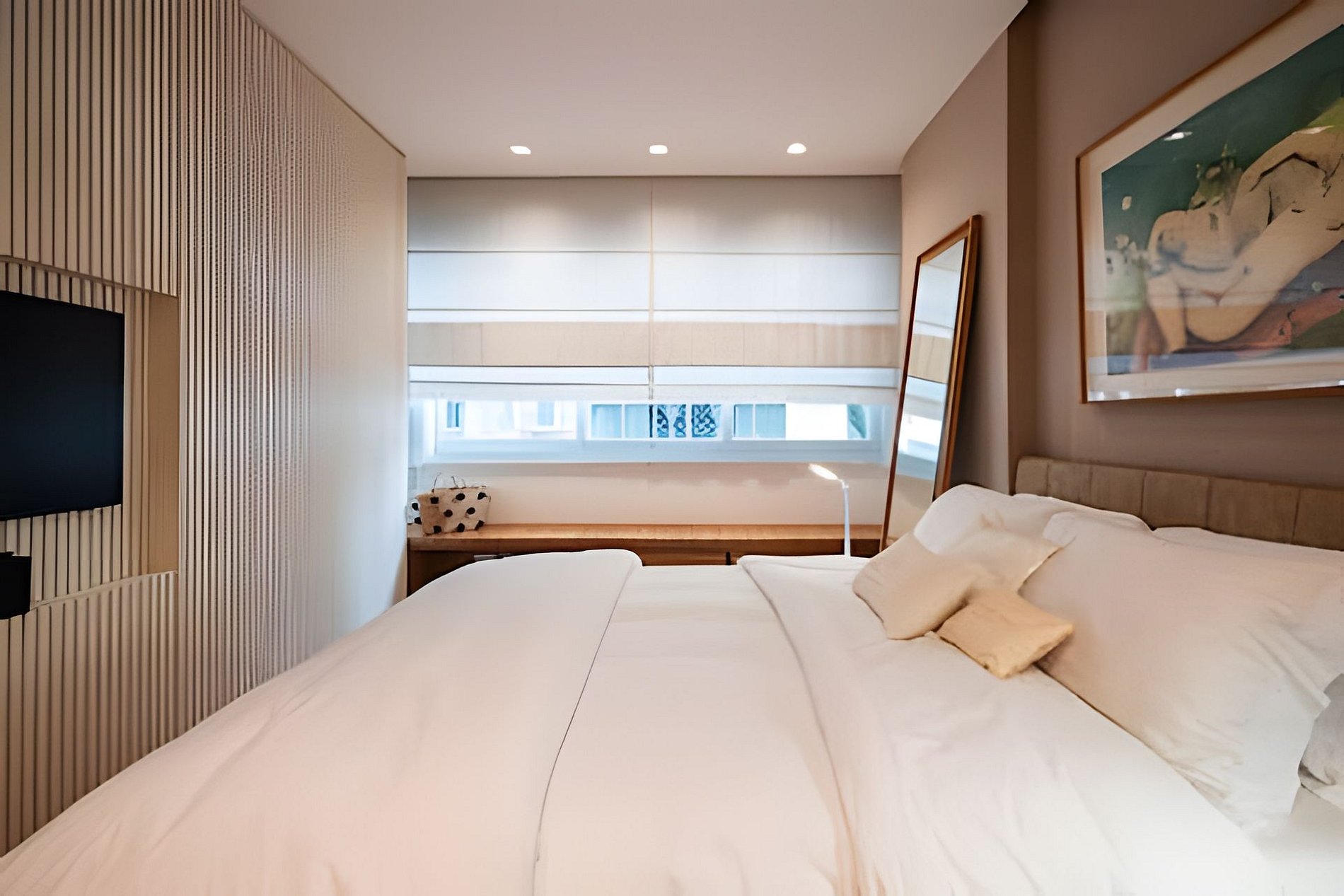 • Suíte 1: cama queen (1,58 x 1,98) com enxoval padrão 5 estrelas, garantindo conforto e noites de descanso impecáveis.